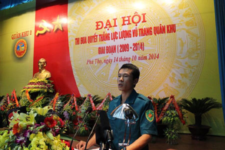 Tiểu đội trưởng Lò Văn Muôn báo cáo thành tích tại Đại hội Thi đua Quyết thắng LLVT Quân khu 2.