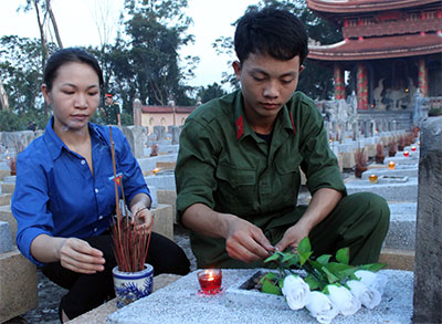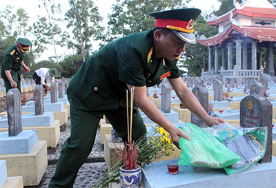 Trung tá Vũ Quang Tuynh, Phó chủ nhiệm Chính trị Lữ đoàn 99 (Binh đoàn 12) thắp hương cho bố đẻ là Liệt sĩ Vũ Xuân Vang, hy sinh năm 1971, đang yên nghỉ tại nghĩa trang.