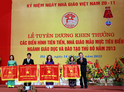 QĐND Online - Sáng 14-11, Hướng tới chào mừng ngày Nhà giáo Việt Nam 20-11, Sở GD - ĐT Hà Nội đã tổ chức lễ tuyên dương khen thưởng các điển hình tiên tiến, nhà giáo mẫu mực tiêu biểu ngành giáo dục và đào tạo Thủ đô năm 2013.