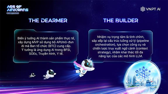Ở đường đua The Dreamer, các đội 2–5 thành viên xác định một vấn đề thực tiễn và đề xuất giải pháp AI. 20 đội có ý tưởng nổi bật sẽ được cung cấp tài nguyên công nghệ của VNPT AI để xây dựng phiên bản sản phẩm thử nghiệm (MVP). Hội đồng đánh giá dựa trên mức độ hoàn thiện, giá trị sử dụng, khả năng thương mại hóa và tiềm năng mở rộng để chọn 5 đội xuất sắc trình diễn sản phẩm tại chung kết.