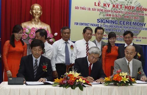 QĐND Online - Ngày 21-7, Ban Quản lý Đường sắt Đô thị TP Hồ Chí Minh ký hợp đồng gói thầu 1b trị giá 23,7 tỷ yên Nhật với Liên doanh nhà thầu Shimizu - Meada (đoạn metro ngầm từ nhà ga Nhà hát Thành phố đến ga Ba Son, gồm 2 nhà ga ngầm) thuộc dự án tuyến đường sắt đô thị số 1 Bến Thành - Suối Tiên.