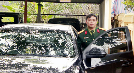| Thượng tá Nguyễn Nhân Khoa, Phó giám đốc hậu cần Xưởng X264 bên chiếc xe ô tô mua từ năm 2010 từ tiền thu hoạch cam. |