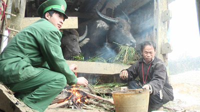 | Cán bộ biên phòng cùng người dân huyện Bát Xát (Lào Cai) chống rét cho gia súc (Ảnh: Báo Lào Cai). |