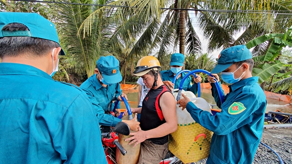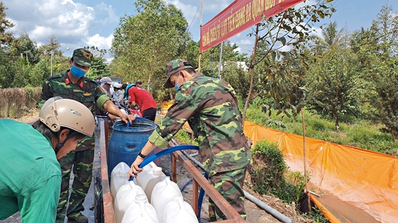 QĐDN Online - Từ ngày 24-3, gần 70 cán bộ, chiến sĩ LLVT tỉnh Tiền Giang tham gia vận chuyển, cung cấp nước ngọt giúp người dân xã Mỹ Long (huyện Cai Lậy, Tiền Giang) tưới cho cây sầu riêng.