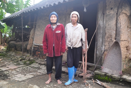 | Hai mẹ con cụ Gái bên căn nhà dột nát. |