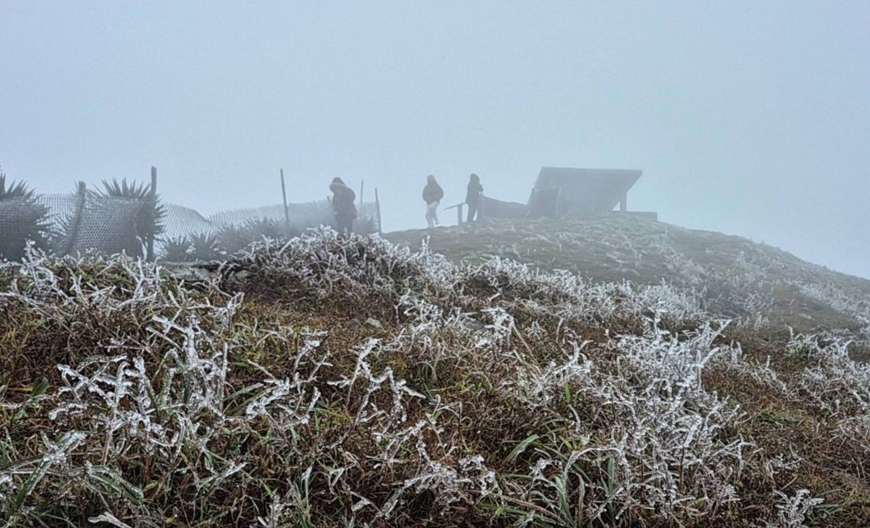 | Nhiều du khách đã tới đỉnh Mẫu Sơn (Lạng Sơn) để tận hưởng không khí băng giá lúc 10 giờ sáng 22-1. Ảnh: Trạm Khí tượng Mẫu Sơn |