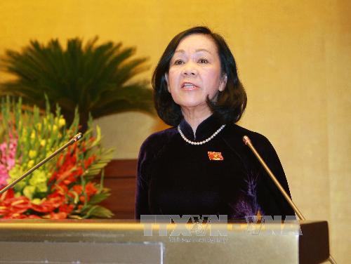 | Chủ nhiệm Ủy ban về các vấn đề xã hội của Quốc hội Trương Thị Mai trình bày Báo cáo thẩm tra dự án Luật an toàn vệ sinh lao động. Ảnh: TTXVN. |