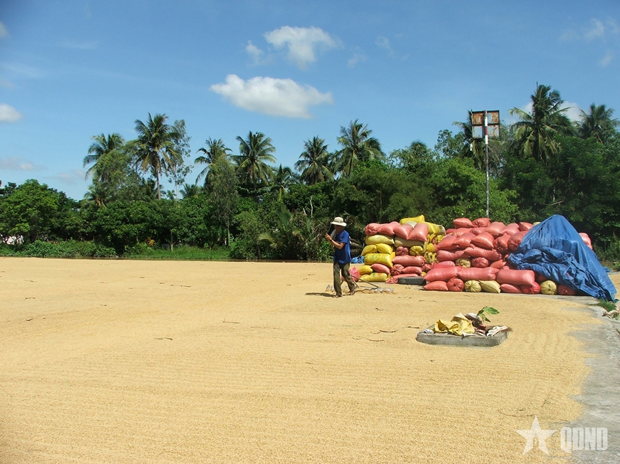 | Nông dân Vĩnh Long phơi lúa. Ảnh NGUYỄN KIỂM |