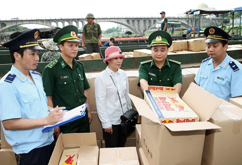 Cán bộ Đồn Biên phòng Cửa khẩu Quốc tế Móng Cái (Quảng Ninh) phối hợp cùng lực lượng hải quan kiểm tra hàng hóa qua cửa khẩu.