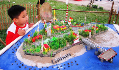 Bé thích thú ngắm nhìn cột mốc chủ quyền, đường băng, công trình bằng mô hình ở Trường Sa.