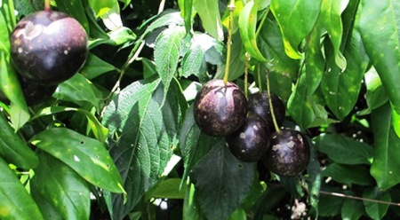 Quả tròn to gần bằng quả trứng gà, vỏ nhẵn mượt không có lông, quả non vỏ màu xanh nhạt, khi quả chín vỏ có màu tím.