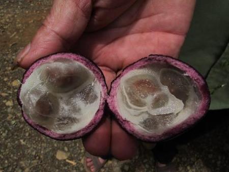 Quả tròn to gần bằng quả trứng gà, vỏ nhẵn mượt không có lông, quả non vỏ màu xanh nhạt, khi quả chín vỏ có màu tím và hơi mềm, bửa vào trong có lớp vỏ mầu hồng, mỗi quả có từ 4 - 6 hạt, các hạt có một lớp cùi màu trắng đục, nhiều nước và mềm bao bọc, bên trong cùi có một hạt to bằng hạt ngô có màu tím và hơi dẹp. Quả Hồng Trâu chín vào thời gian tháng 6, 7, 8 hằng năm.