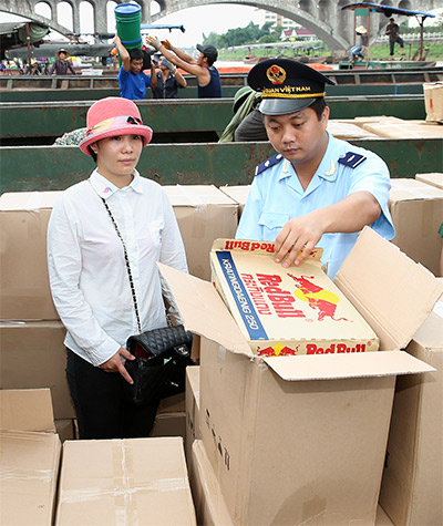 Chị Bùi Thị Uyên, Công ty TNHH Hải Hằng ở Móng Cái, kiểm tra lô hàng nước tăng lực Red bull xuất khẩu sang Trung Quốc.