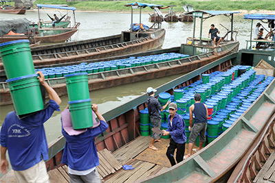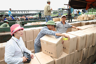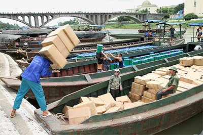 Hàng hóa được lực lượng bốc xếp vận chuyển xuống đò máy.