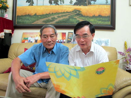 Trung tướng Nguyễn Đức Soát và thành viên Ban Vận động thành lập Hội Hỗ trợ khắc phục hậu quả bom mìn Việt Nam, trao đổi công việc trước ngày Đại hội. Ảnh: Hùng Hà