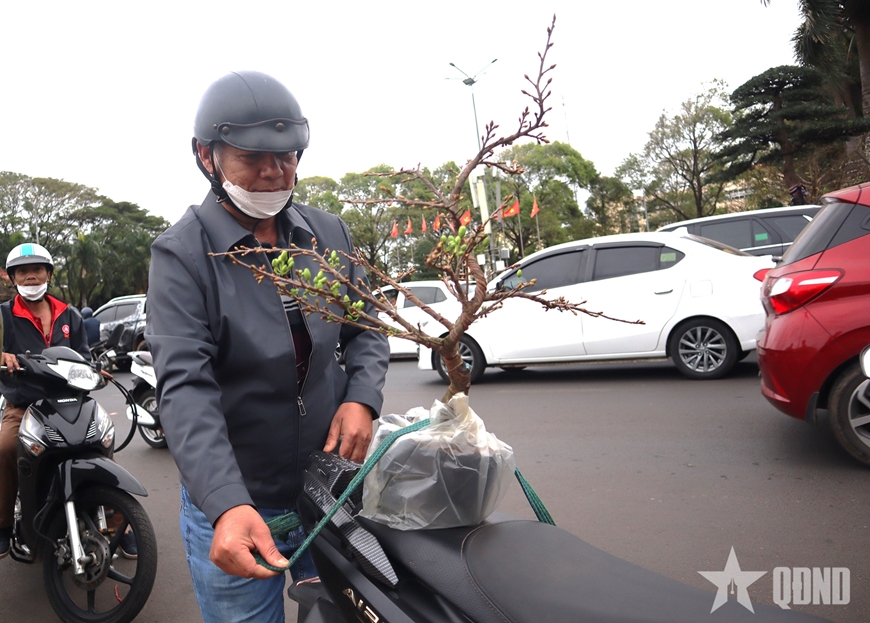 | Người dân mang hoa mai về nhà, mang theo sắc xuân đón Tết. |