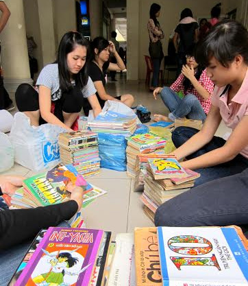 | Nhóm sinh viên tình nguyện Trường Đại học Mở TP Hồ Chí Minh quyên góp sách trong chương trình lần 1. |