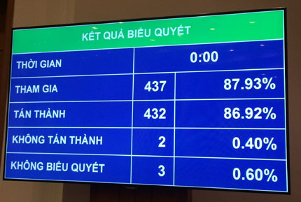 | Kết quả Biểu quyết thông qua Luật Tổ chức Quốc hội (sửa đổi). Ảnh: Hoàng Lan. |