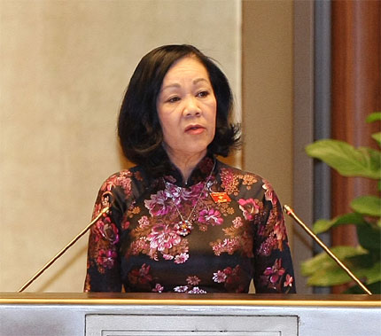 | Ủy viên Ủy ban thường vụ Quốc hội, Chủ nhiệm Ủy ban về các vấn đề xã hội Trương Thị Mai trình bày Báo cáo giải trình, tiếp thu ý kiến của đại biểu Quốc hội về Dự thảo Luật Bảo hiểm xã hội (sửa đổi). Ảnh: Phạm Kiên – TTXVN. |
