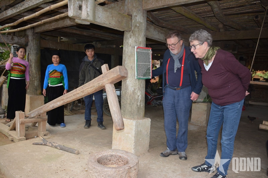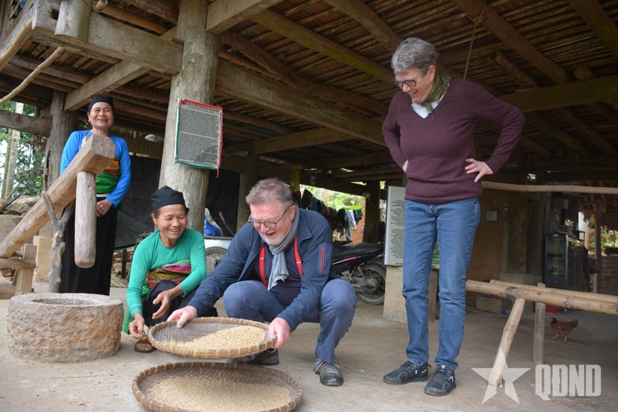 | Du khách nước ngoài trải nghiệm giã gạo tại nhà sàn cổ Pù Luông, bản Chiềng Lau (Bá Thước, Thanh Hóa). |