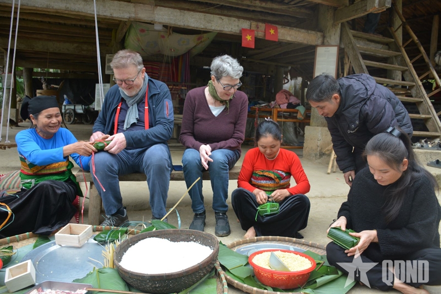 | Khách du lịch nước ngoài trải nghiệm hoạt động gói bánh chưng ngày Tết ở bản Chiềng Lau (Bá Thước, Thanh Hóa). |