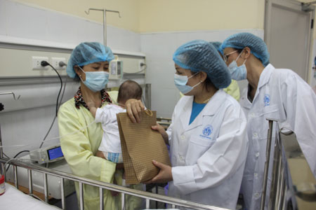 Bộ trưởng Bộ Y tế Nguyễn Thị Kim Tiến tặng quà cho bệnh nhân nhi mắc sởi nặng.