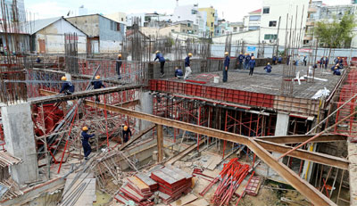Công nhân Xí nghiệp 11, Tổng công ty 319, thi công công trình Trụ sở nhà làm việc-Hội trường Sở Cảnh sát Phòng cháy, chữa cháy TP Hồ Chí Minh.