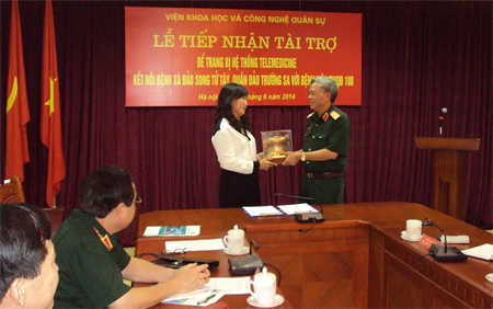 Lãnh đạo Viện Khoa học và Công nghệ quân sự trao quà tặng bà Phan Thị Tố Duyên tại buổi lễ ký hợp đồng tài trợ xây dựng hệ thống Telemedicine (tháng 6-2014)