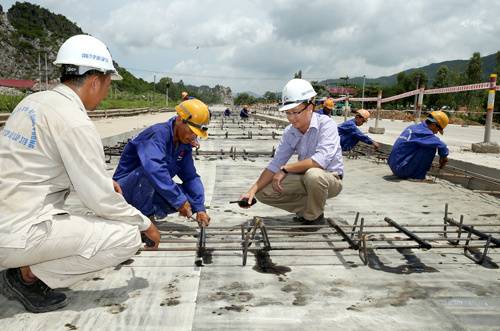 Các kỹ sư và công nhân Công ty Cổ phần Xây lắp 319 làm cốt thép thi công mặt đường bê tông xi măng khu vực trạm thu phí.