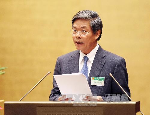 | Bộ trưởng Bộ Tài nguyên và Môi trường Nguyễn Minh Quang trình bày Tờ trình về Dự án Luật tài nguyên, môi trường biển và hải đảo. Ảnh: Nhan Sáng - TTXVN. |