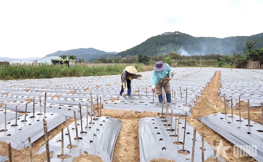 | Phủ bạt, cắm cọc chuẩn bị xuống giống. |