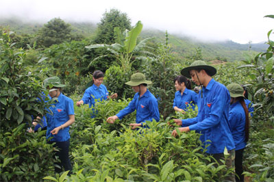 | Trí thức trẻ Đoàn KT-QP 4 đang thu hái chè Shan tuyết ở Kỳ Sơn. |