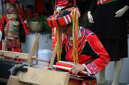 | Nghệ nhân Sìn Thị Giang, dân tộc Pà Thẻn sinh sống tại huyện Quang Bình, tỉnh Hà Giang biểu diễn dệt thổ cẩm. |