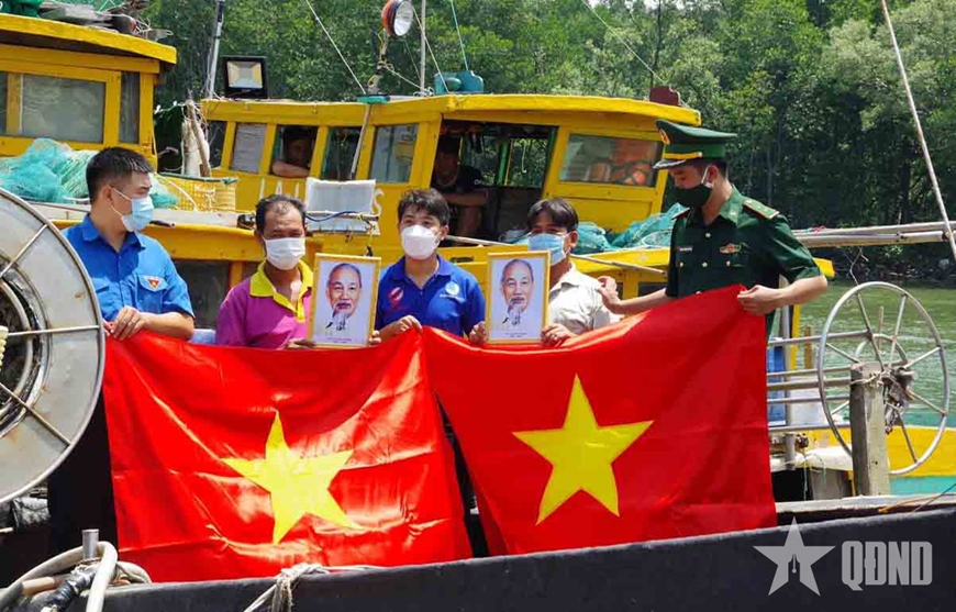 | Cán bộ, chiến sĩ Ban chỉ huy Bộ đội Biên phòng TP Hồ Chí Minh tặng cờ Tổ quốc và phát tờ rơi tuyên truyền cho ngư dân. |