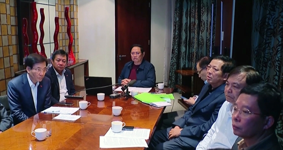 Thủ tướng Phạm Minh Chính chủ trì họp trực tuyến từ Nam Phi, chỉ đạo khắc phục hậu quả mưa lũ. Ảnh: VTV |
