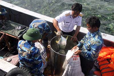 Thợ lặn Phan Đức Phượng (ngoài cùng bên phải) đang chuyển cá cho bộ đội tàu HQ 561 tại đảo Đá Tây.