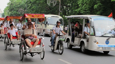 | Du khách tham quan bằng xích lô và xe điện quanh bờ hồ Hoàn Kiếm-Hà Nội. |
