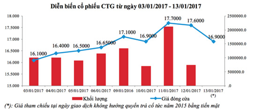 Trong thời gian qua, cổ phiếu CTG đã có sự tăng trưởng ấn tượng khi thông tin trả cổ tức năm 2015 bằng tiền mặt được công bố. Kể từ ngày 3-1-2017, khi VietinBank thông báo chốt danh sách cổ đông trả cổ tức năm 2015 đến ngày 12-1-2017, giá cổ phiếu CTG đã tăng 1.500 đồng (từ 16.100 đồng/cp lên 17.600 đồng/cp), tương đương 9,32%.