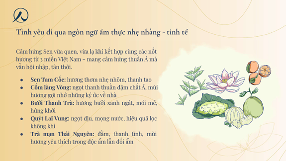 Lấy cảm hứng từ hoa sen, mùi hương này mang đến sự quen thuộc nhưng cũng đầy mới mẻ, với sự hòa quyện tinh tế của nốt hương đặc trưng từ ba miền Việt Nam.