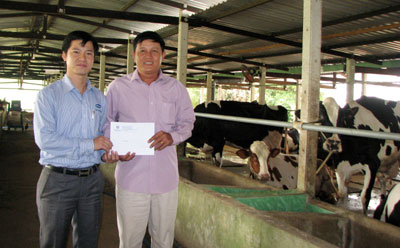 | Đại diện công ty Vinamilk, trao quà hỗ trợ chăm lo Tết Nguyên đán 2014 cho ông Phan Văn Phú, người chăn nuôi bò sữa ở ấp Giồng Sao, xã Tân Phú Trung, huyện Củ Chi, TP Hồ Chí Minh. Ảnh: Quỳnh Trang. |