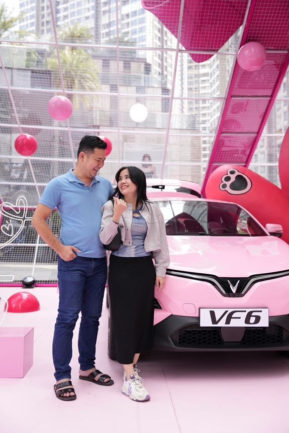 Suốt từ sáng 20-10, VinFast VF 6 đã là tâm điểm của mọi sự chú ý của người dân tại Vincom Landmark 81 (TP Hồ Chí Minh). Thời gian diễn ra sự kiện từ 10 giờ, tuy nhiên nhiều khách hàng yêu thích SUV này đã có mặt từ rất sớm để tận mắt chiêm ngưỡng. Phiên bản đặc biệt màu hồng khiến nhiều khách tham quan thích thú.