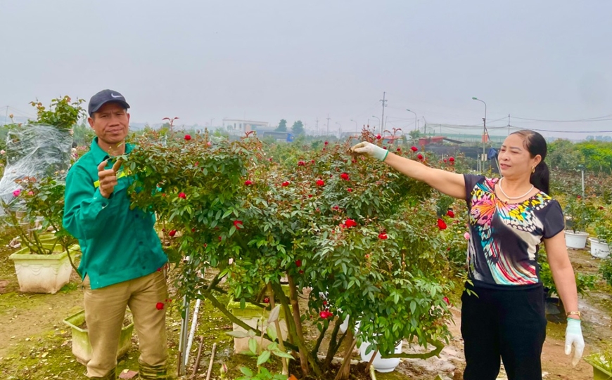 Cách ruộng hoa của anh Thắng không xa, cánh đồng hoa hơn 3.000m2 của chủ vườn Nguyễn Nhân Thành với đủ loại hồng, cúc, lay ơn... đang vào độ thu hoạch. Những ngày giáp Tết, ông Thành dường như không có ngày nghỉ: Từ sáng sớm đến chiều kiểm tra cây, tư vấn khách hàng...; đêm tối chong đèn điều chỉnh để hoa nở đúng thời điểm mong muốn. Ông Thành kể, nông dân Mê Linh gần Tết bận rộn mà vui, không chỉ vì được mùa hoa Tết mà còn vì nét đẹp văn hóa, tình làng nghĩa xóm trên những cánh đồng, thửa ruộng. “Người dân chúng tôi coi nhau như một gia đình. Qua bao năm tháng, chẳng ai ngần ngại, tính toán công sức giúp nhau trồng cây, chăm hoa, chuyển hàng... Tối muộn xong việc, chúng tôi cùng nhau ăn cơm, trao đổi công việc hôm nay, bàn chuyện mặt hàng sắp tới. Đó là tình cảm xóm làng và cũng là những chia ngọt sẻ bùi quý giá của nghề nông”, ông Thành tự hào nói.
