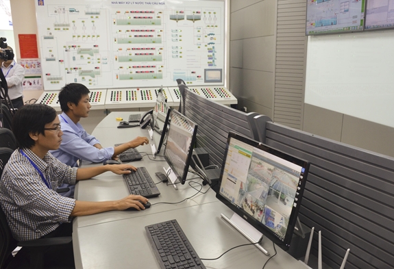 Các kỹ thuật viên điều khiển hệ thống xử lý nước thải của Trạm xử lý nước thải làng nghề Cầu Ngà (huyện Hoài Đức, TP Hà Nội). Ảnh: ĐỨC LÊ |