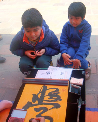 Những em thiếu nhi cũng tỏ ra háo hức với nghệ thuật thư pháp.