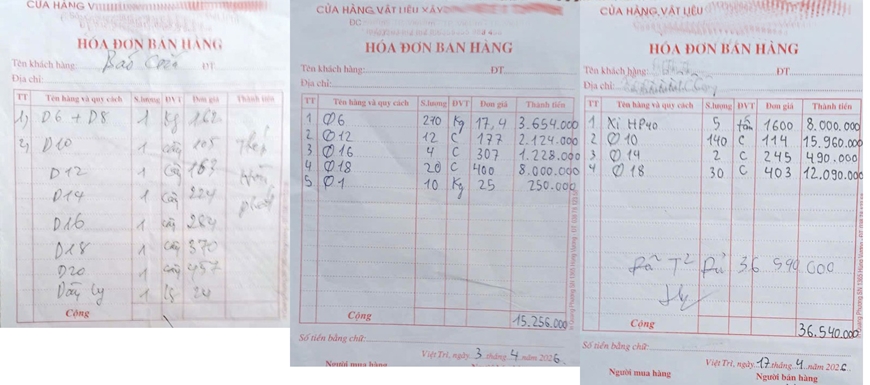 Phiếu báo giá và mua vật liệu xây dựng của anh Nguyễn Anh Dũng, trong đó nhiều loại sắt tăng và neo ở mức cao.