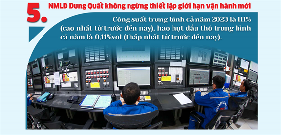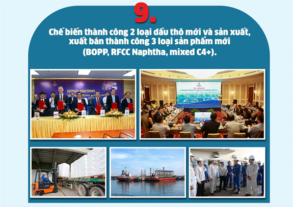Năm qua, Nhà máy Lọc dầu Dung Quất vận hành ở công suất 111%; sản lượng sản xuất ướt đạt 7,35 triệu tấn, vượt 31% kế hoạch. Sản lượng tiêu thụ ướt đạt 7,26 triệu tấn, vượt 29% kế hoạch; điều này đã giúp Công ty đạt Tổng doanh thu gần 146.500 tỷ đồng, vượt 54% kế hoạch; nộp NSNN trên 16.615 tỷ đồng, vượt 69% kế hoạch và lợi nhuận sau thuế vượt xa kế hoạch năm.