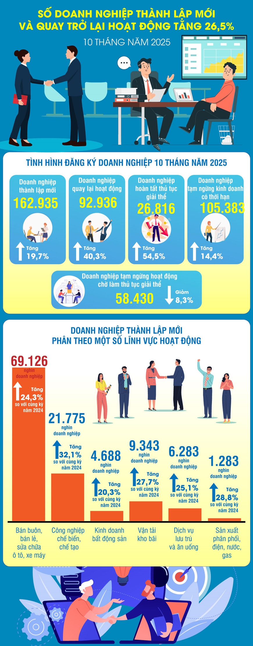 10 tháng năm 2025, cả nước có 162,9 nghìn doanh nghiệp đăng ký thành lập mới (tăng 19,7%) và 92,9 nghìn doanh nghiệp quay trở lại hoạt động (tăng 40,3%), nâng tổng số doanh nghiệp thành lập mới và quay trở lại hoạt động lên 255,9 nghìn doanh nghiệp - tăng 26,5% so với cùng kỳ năm 2024.