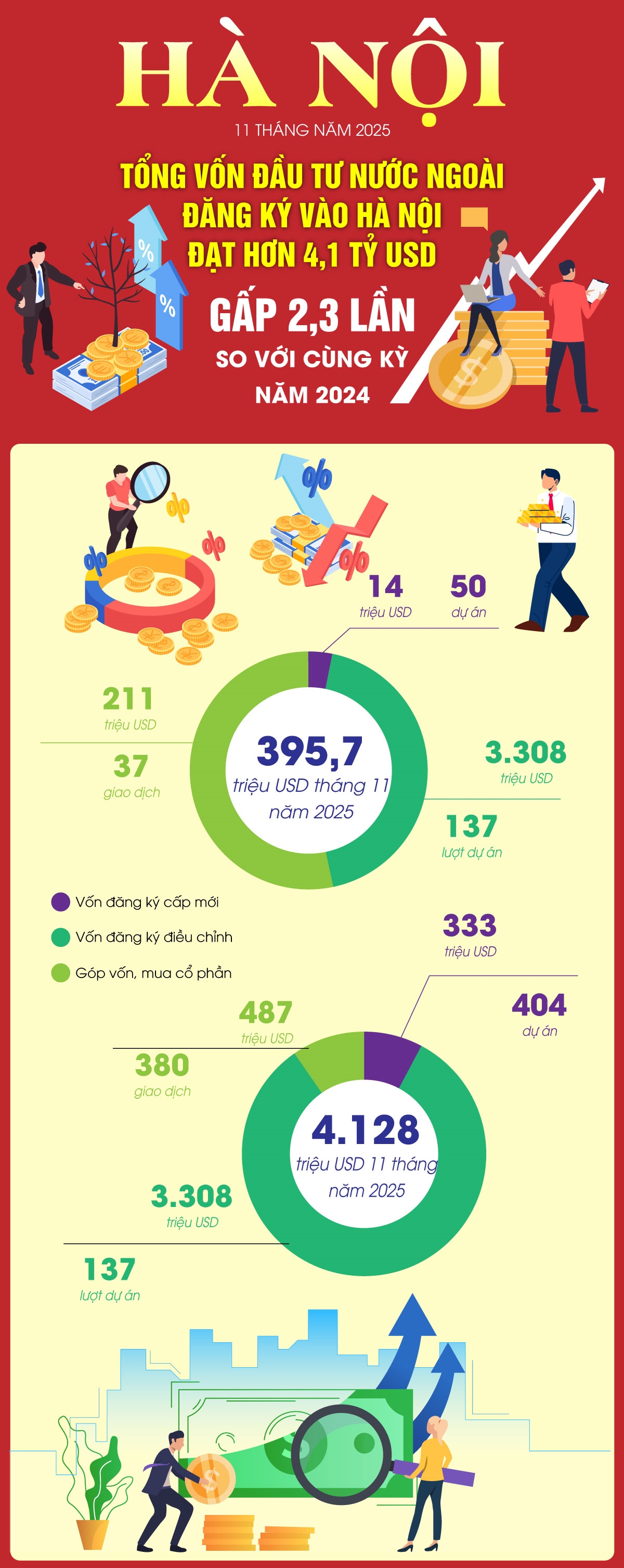 11 tháng năm 2025, vốn đầu tư nước ngoài đăng ký vào Hà Nội đạt 4,128 tỷ USD, gấp 2,3 lần cùng kỳ năm 2024. Trong đó, đăng ký cấp mới 404 dự án, với số vốn 333 triệu USD; 137 dự án điều chỉnh tăng, giảm vốn đăng ký 3.308 triệu USD, 380 lượt nhà đầu tư nước ngoài góp vốn, mua cổ phần đạt 487 triệu USD.