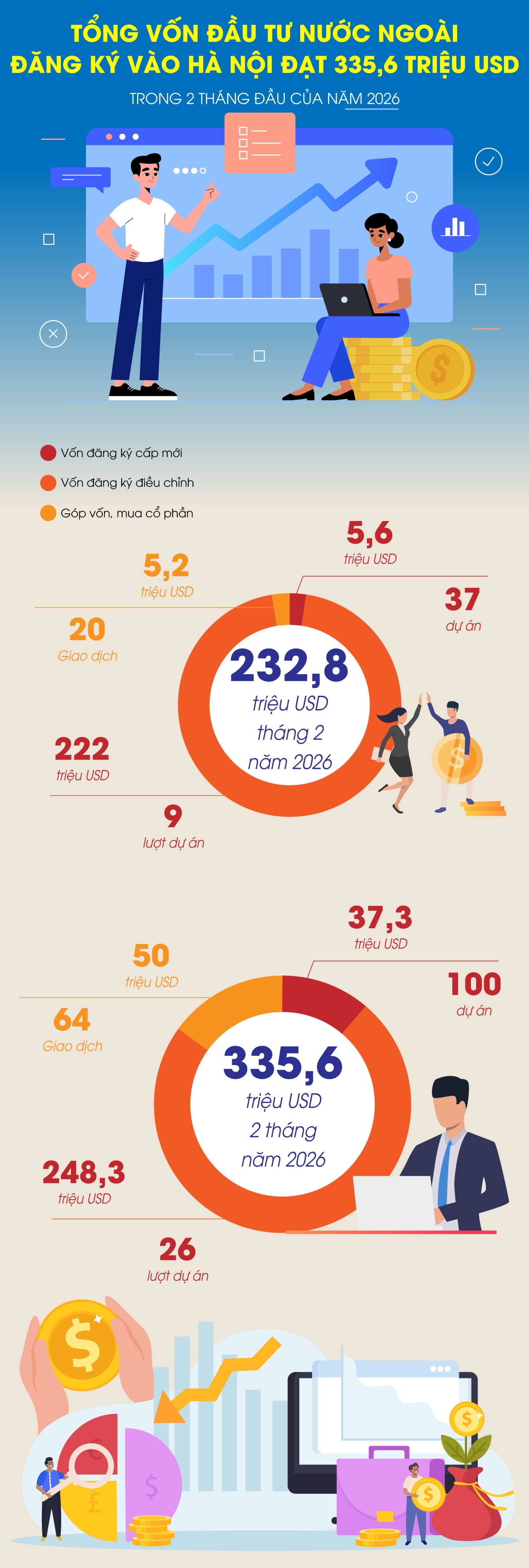 2 tháng đầu năm 2026, vốn đầu tư nước ngoài vào Hà Nội đạt 335,6 triệu USD. Trong đó, đăng ký cấp mới 100 dự án với số vốn đạt 37,3 triệu USD; 26 dự án bổ sung tăng vốn đầu tư với 248,3 triệu USD; 64 lượt nhà đầu tư nước ngoài góp vốn, mua cổ phần đạt 50,0 triệu USD.