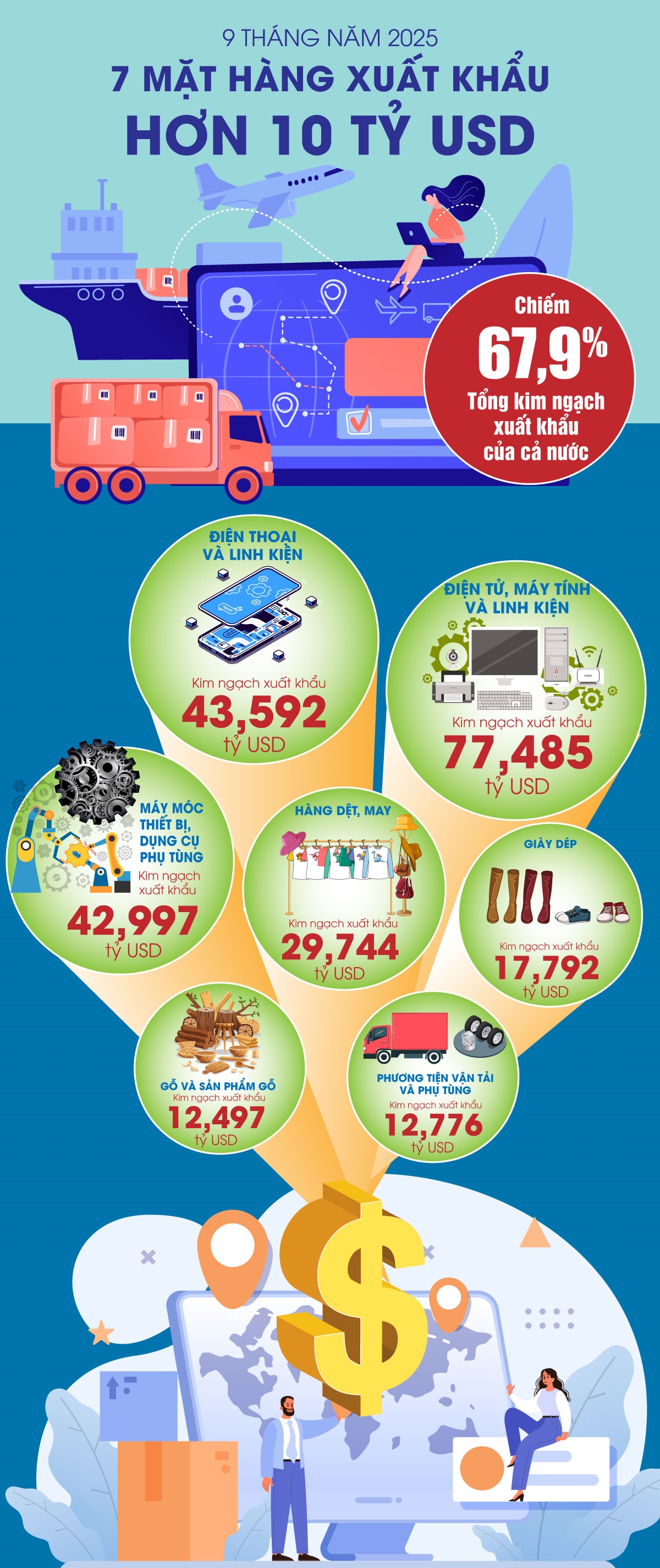 9 tháng năm 2025, có 7 mặt hàng xuất khẩu trên 10 tỷ USD, chiếm 67,9% tổng kim ngạch xuất khẩu. Trong đó, xuất khẩu điện tử, máy tính và linh kiện đạt kim ngạch 77,485 tỷ USD; điện thoại các loại và linh kiện đạt 43,592 tỷ USD; máy móc, thiết bị, dụng cụ, phụ tùng khác đạt 42,997 tỷ USD; hàng dệt, may đạt 29,744 tỷ USD…